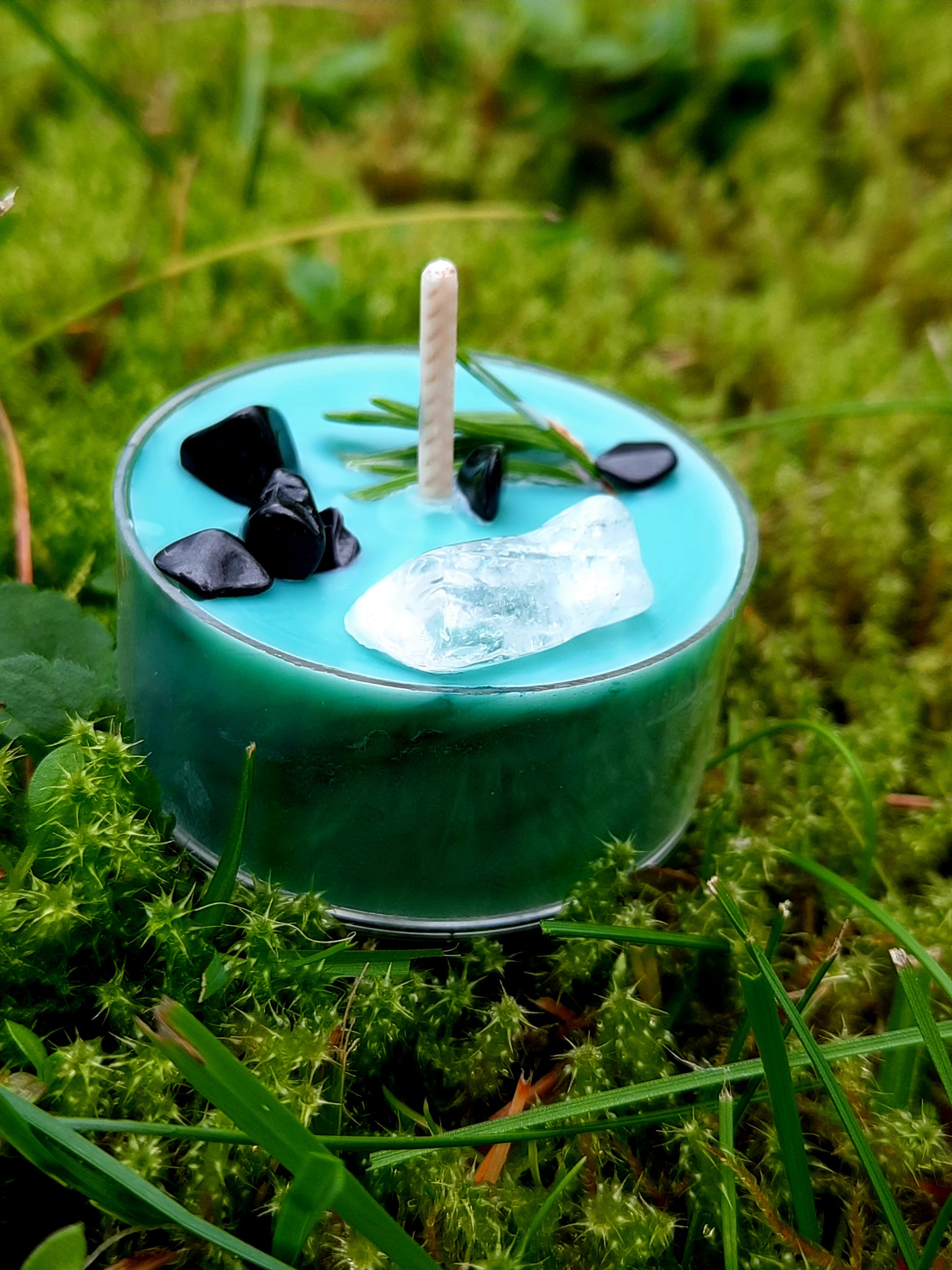 Dieses Kristallteelicht duftet nach heimischen Nadelbäumen und wurde mit ausgewählten Mini-Trommelsteinen zu deinem Thema ergänzt. Frische Kiefernnadeln ergänzen den würzig - holzigen Duft.