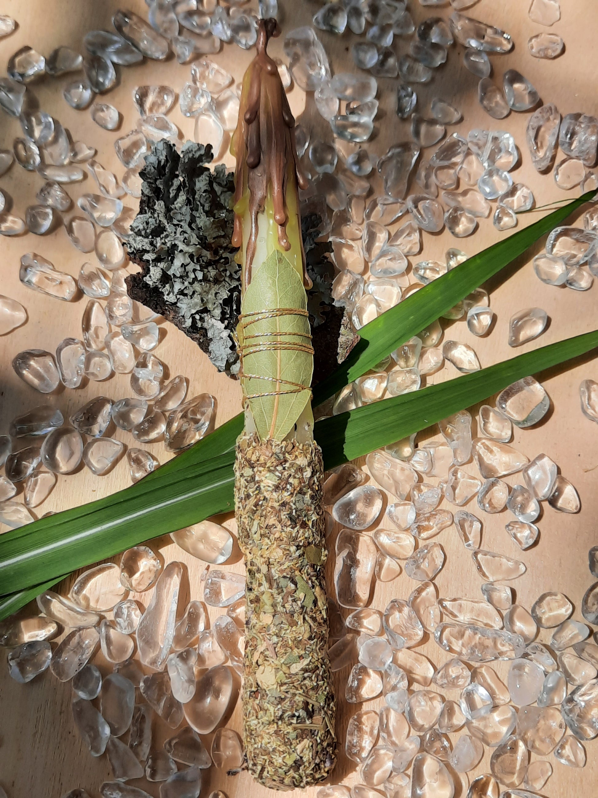 Es handelt sich hier um keine normale handelsübliche Kerze. Stellen Sie sich bitte auf einen feuerfesten Untergrund und lassen Sie sie NIE unbeaufsichtigt stehen. Durch die Öle und Kräuter kann es zu Funkenflug kommen, auch sicher auch die Umgebung der Kerze.