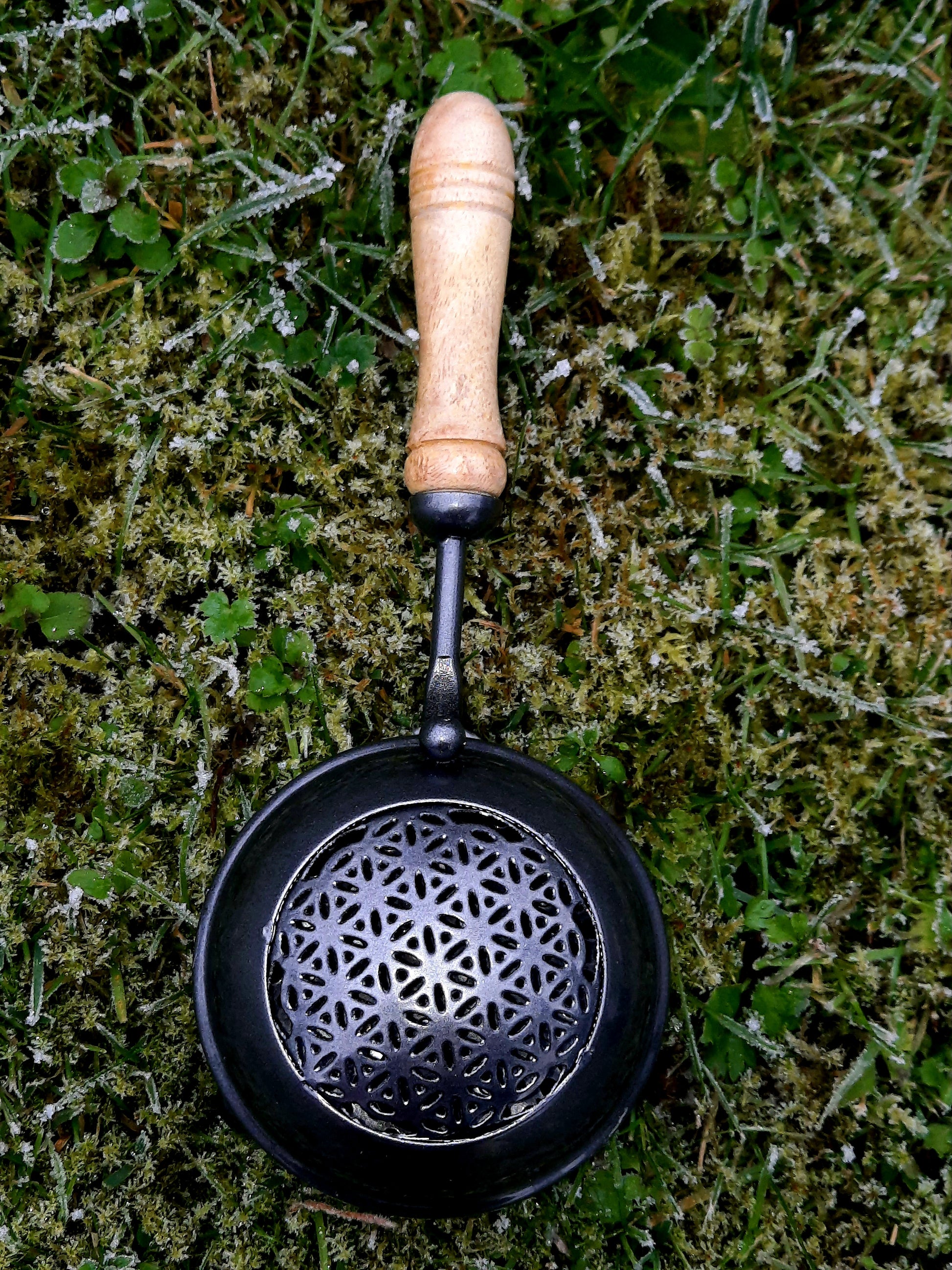 Die Räucherpfanne besteht aus Eisen, hat einen Durchmesser von 8cm und einen Holzstiel. Die Länge beträgt 7,5cm.