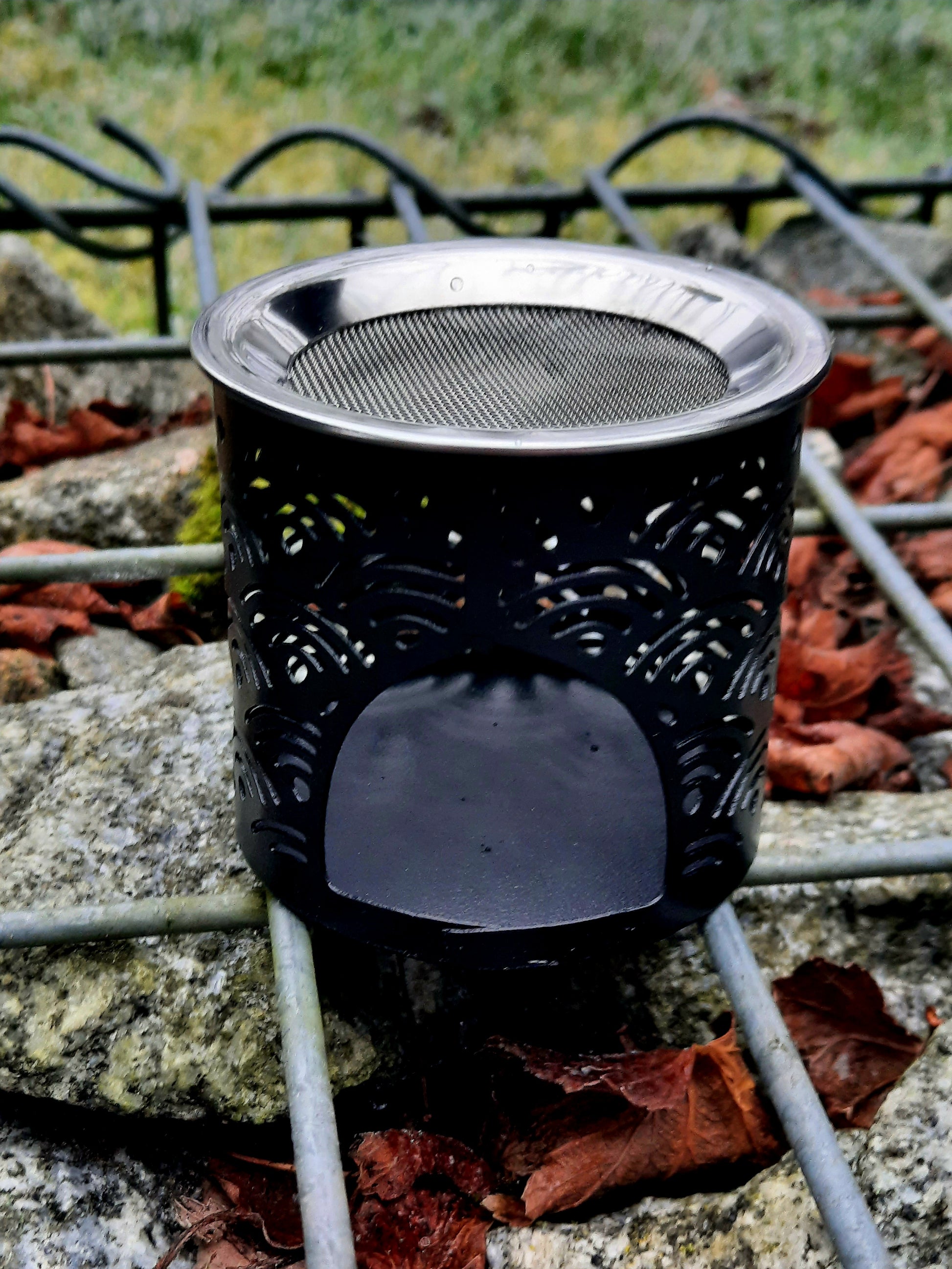 Dieses Stövchen ist aus Eisen gefertigt und 8cm hoch und hat einen Durchmesser von 9cm. Es wird mit einem Teelicht betrieben und das Räuchergut wird oben auf das Sieb gegeben.
