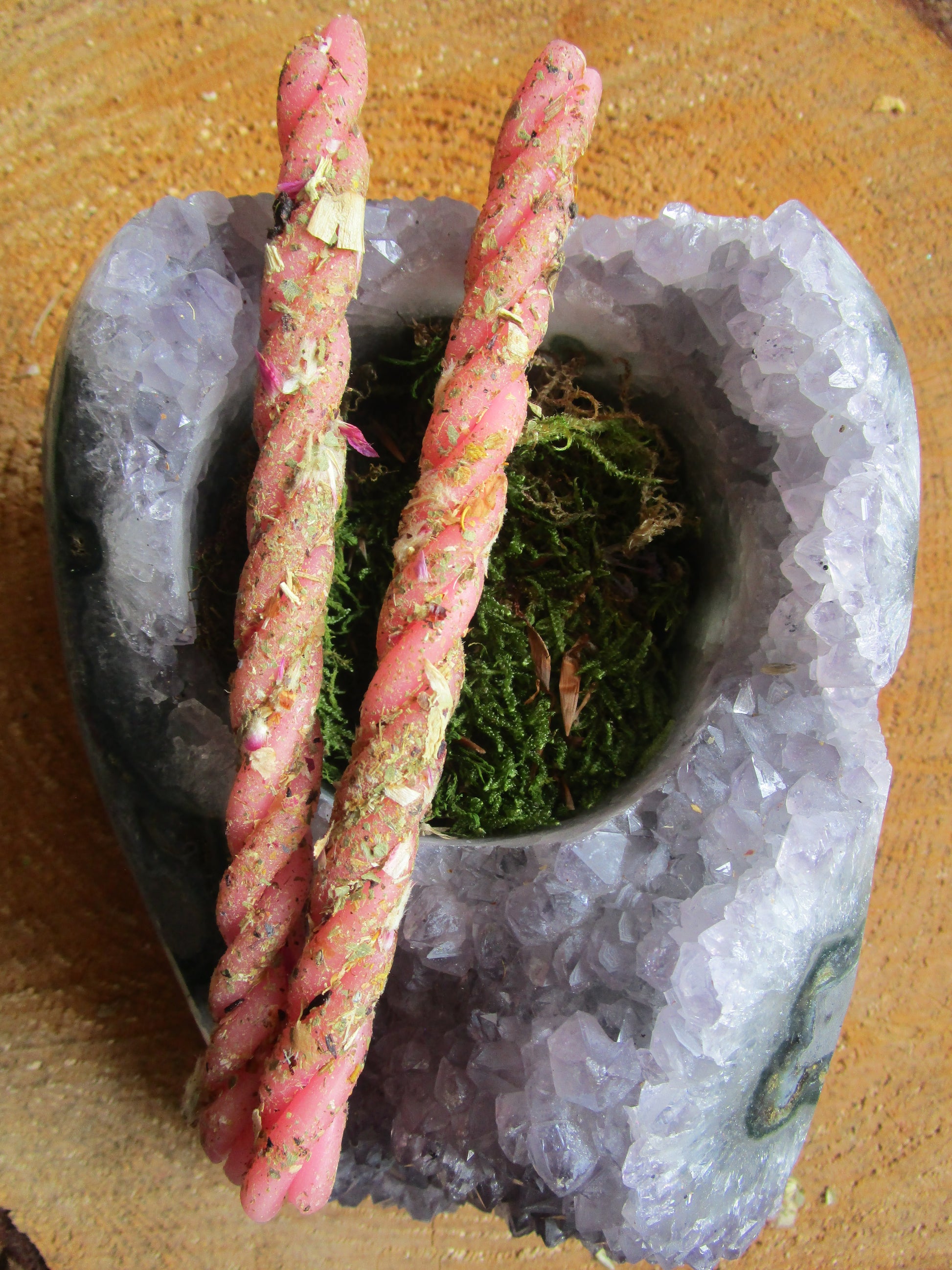Die liebevoll von Hand gedrehte rosa Bienenwachskerze duftet nach Rose und wurde mit Kräutern und Blüten wie Rosen usw. für dich gefertigt.