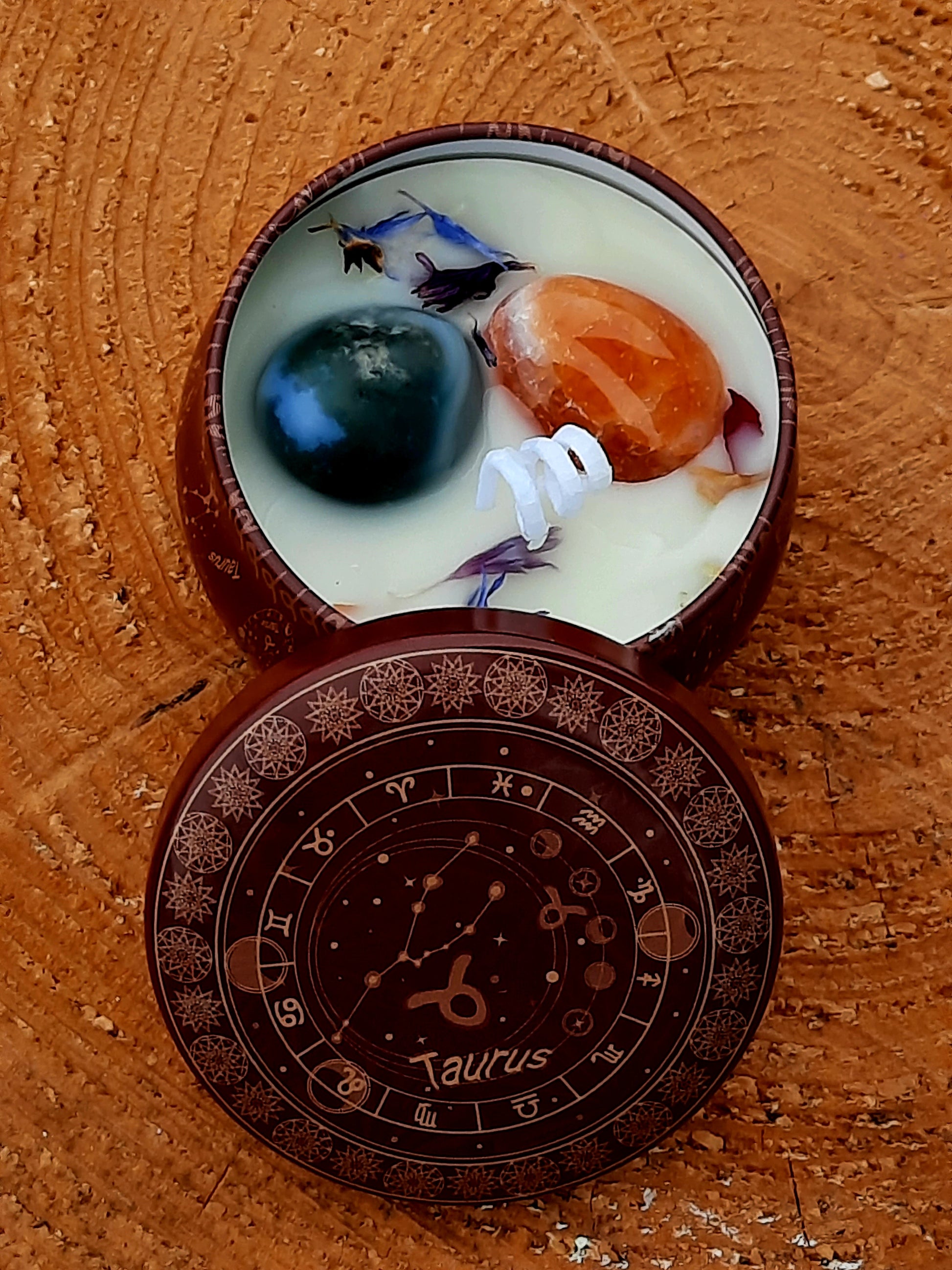 Die Kerze wirkt mit den Steinen des Stieres auf das Energiezentrum deines Körpers und schenkt dir Energie für deinen Alltag.